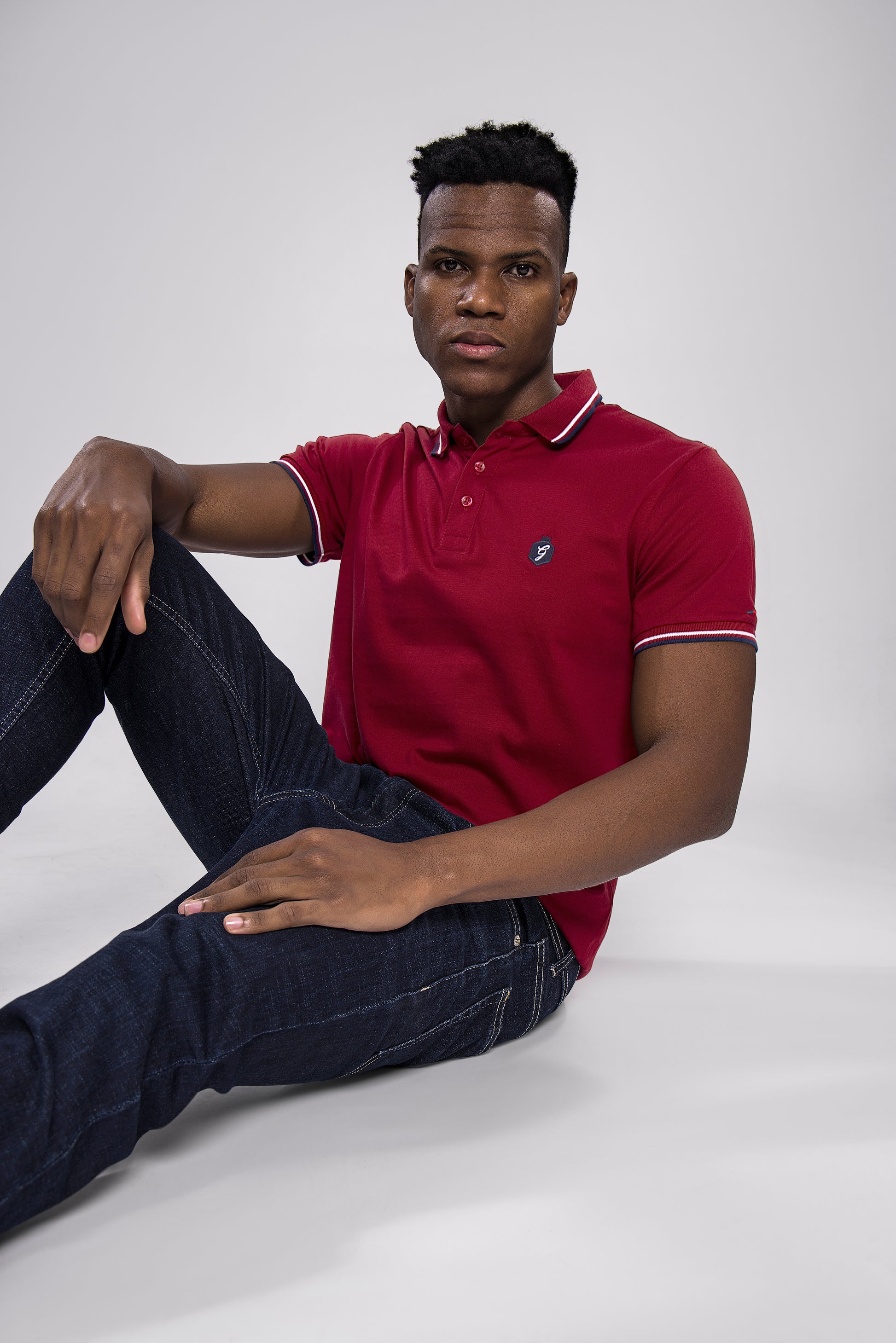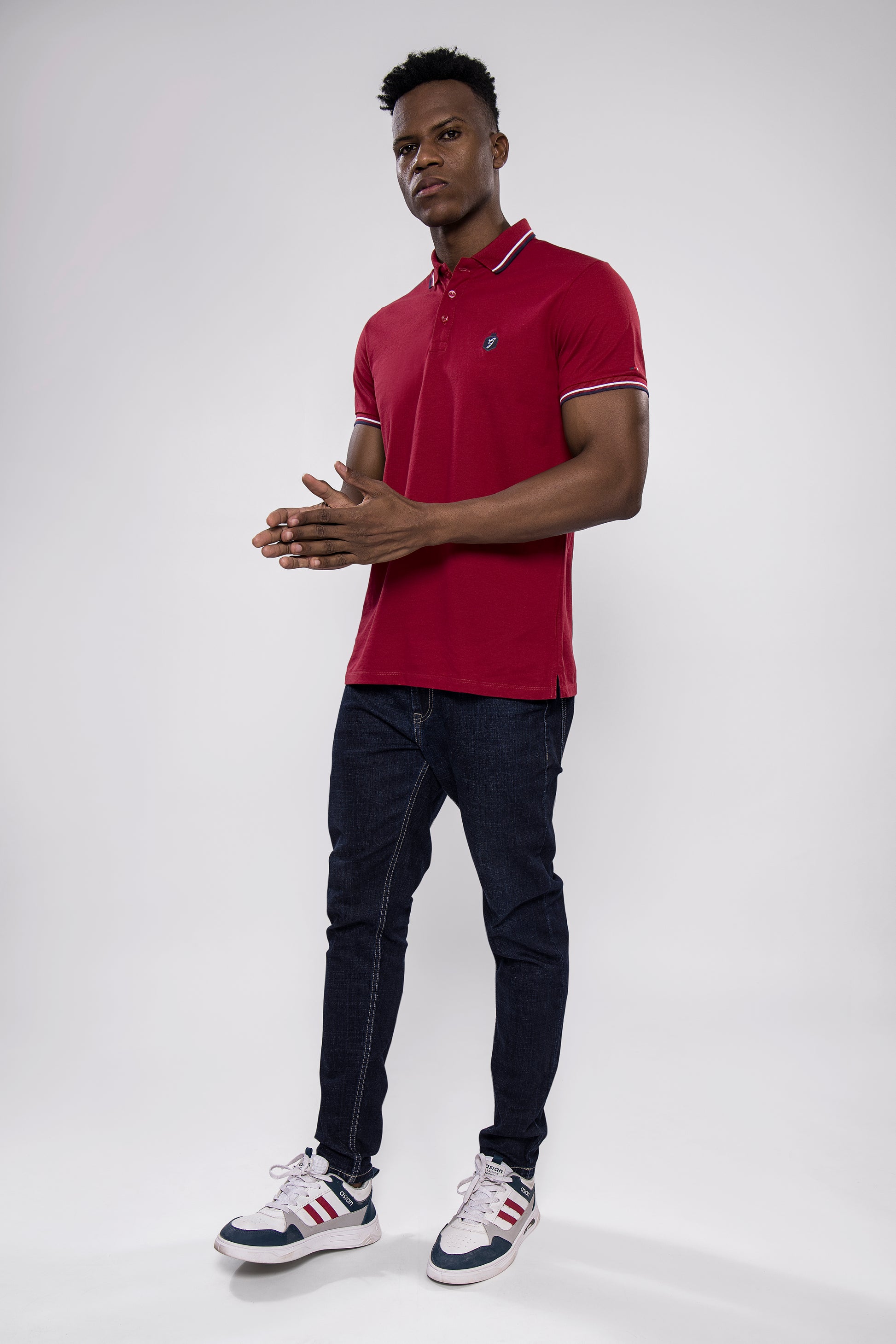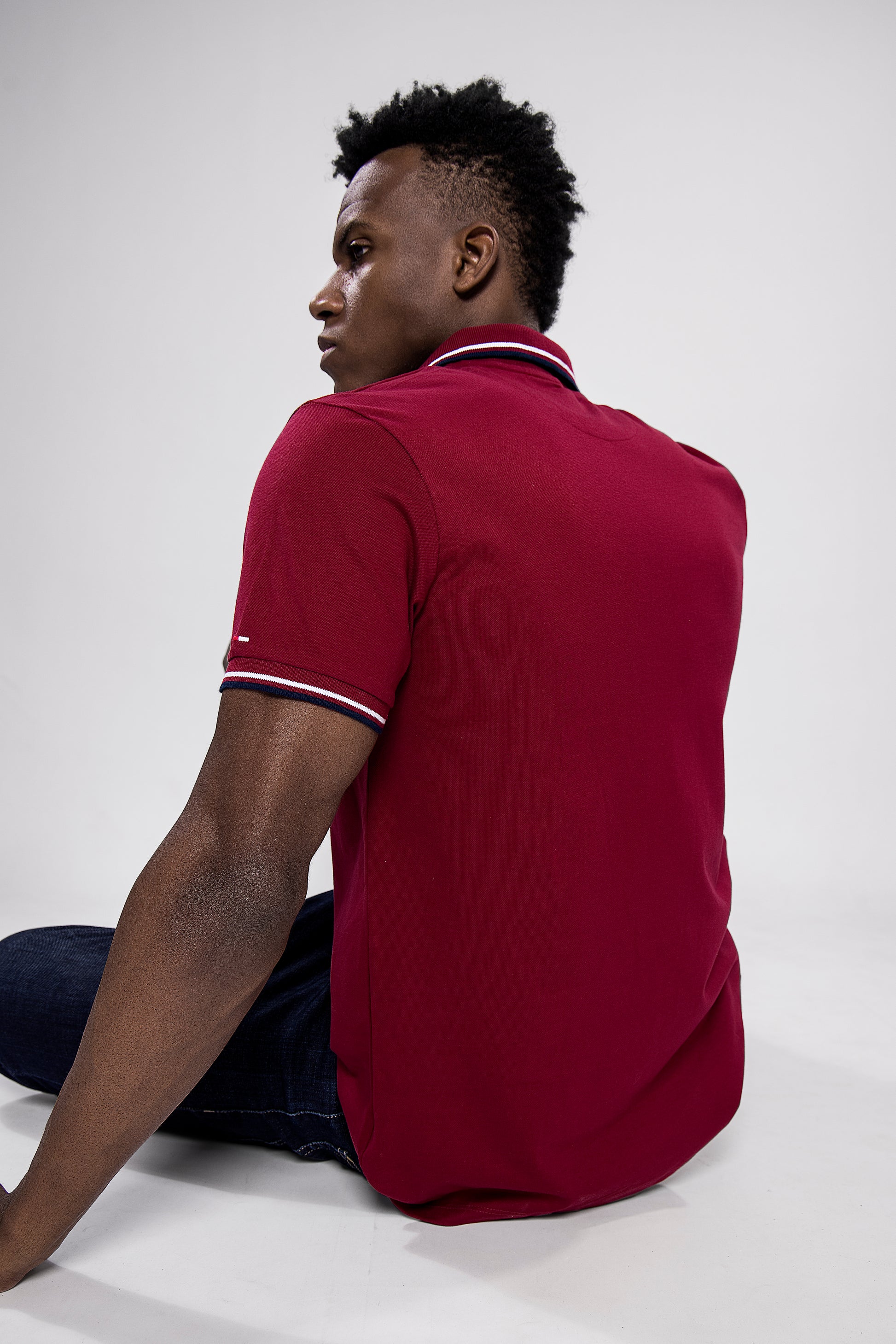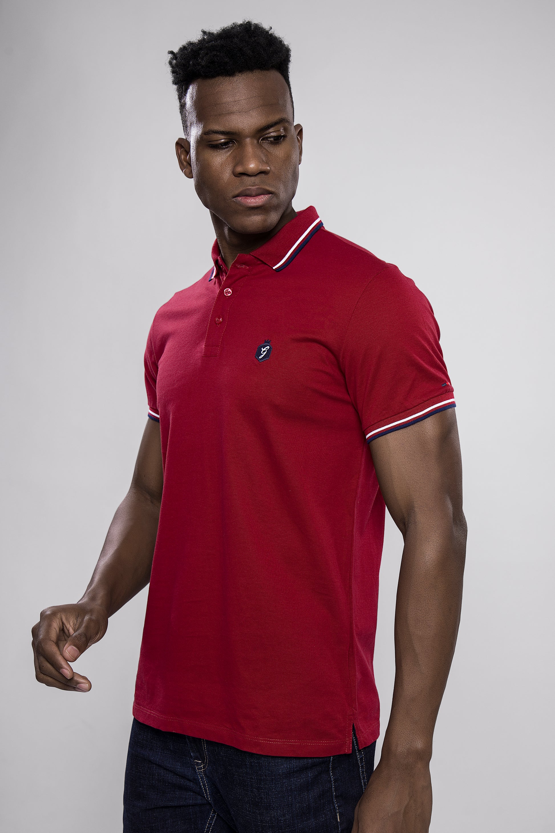 Make a bold yet classy statement with this solid maroon polo T-shirt, tailored for modern-day comfort and timeless appeal. Featuring elegant white and navy tipping on the collar and sleeves, along with a subtle chest badge, this tee is the perfect blend of smart and casual style.