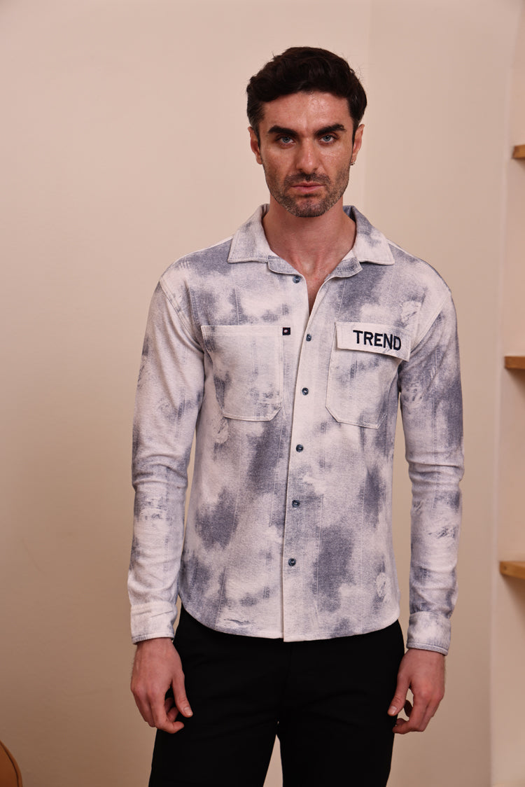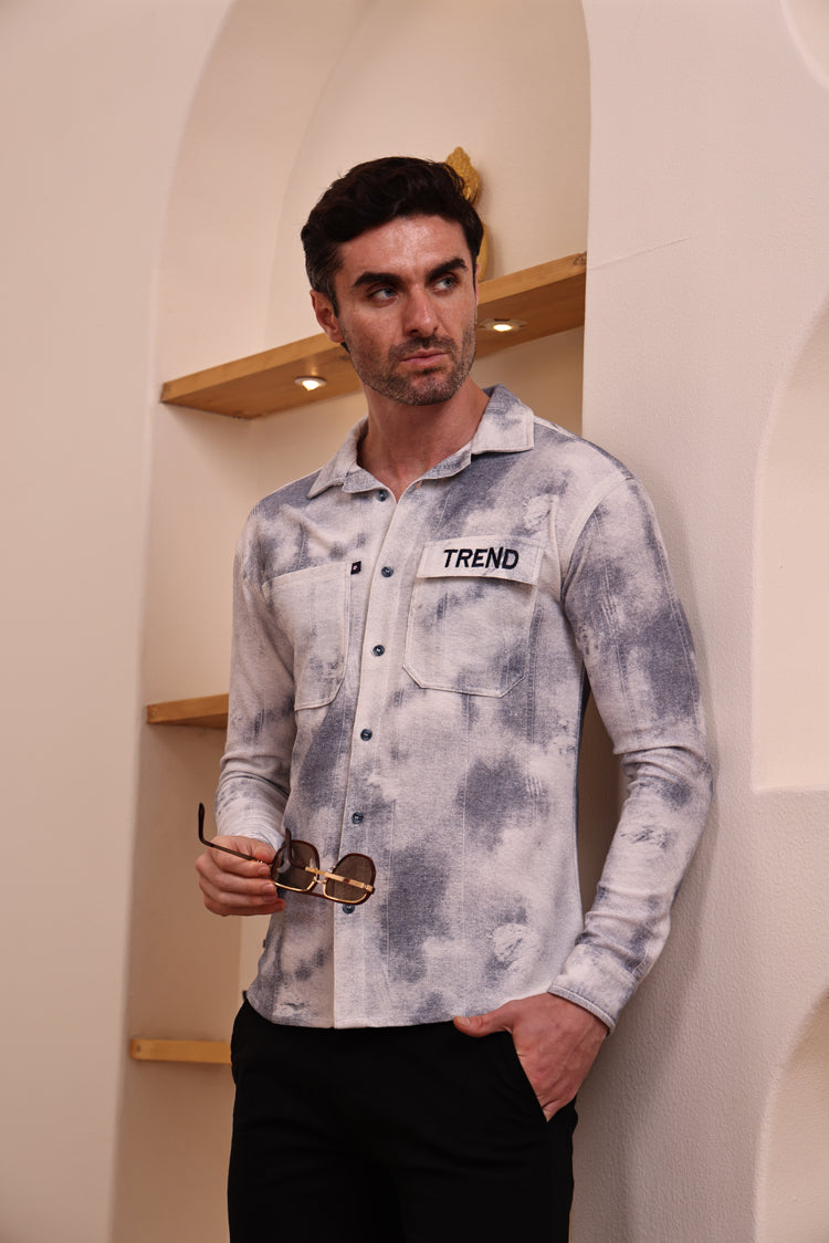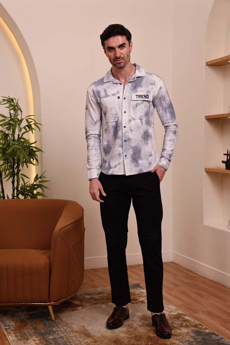 Elevate your casual wardrobe with this trendy shacket-style shirt. Designed with a unique grey & white washed effect, this shirt combines comfort and modern streetwear vibes. It features a classic collar, button-down front, and dual chest pockets – one with a bold “TREND” patch for added style. The full sleeves with roll-up option make it versatile for any occasion.