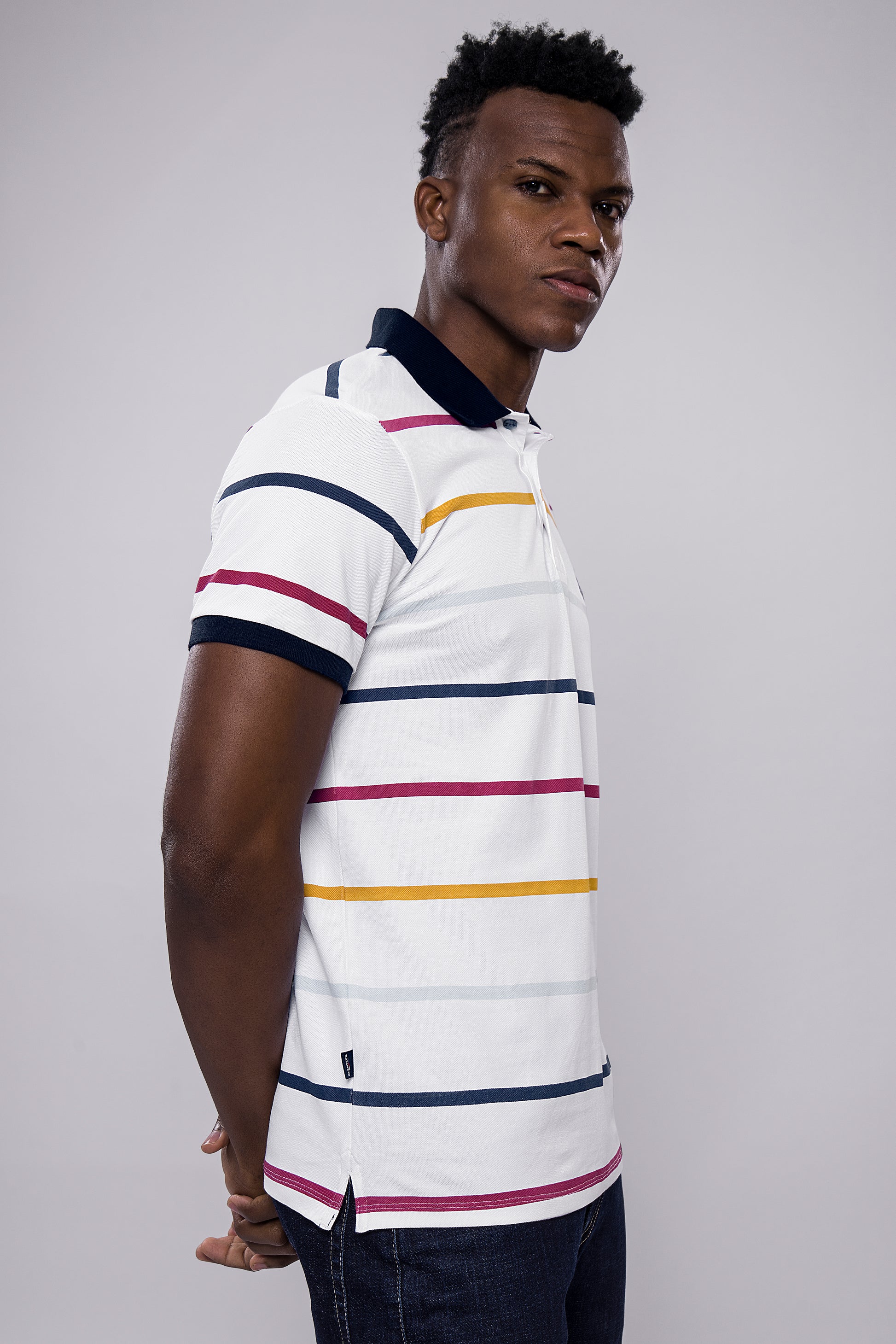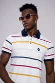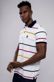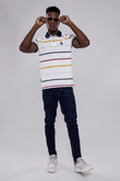 Men’s White Multi-Stripe Polo T-Shirt with Navy Collar & Logo Badge