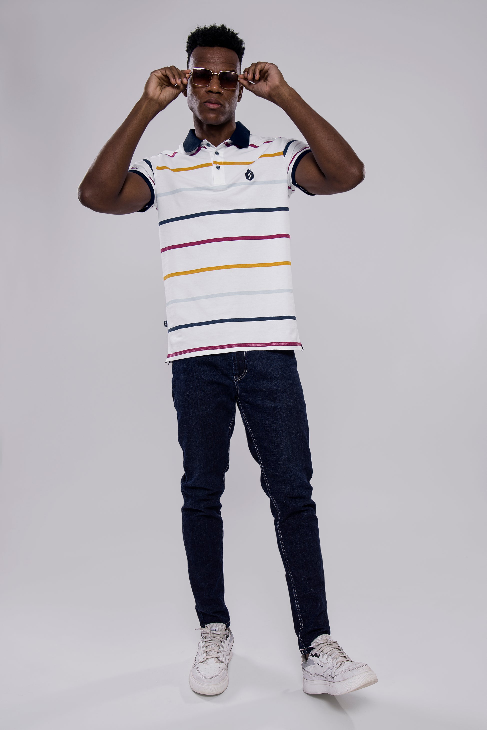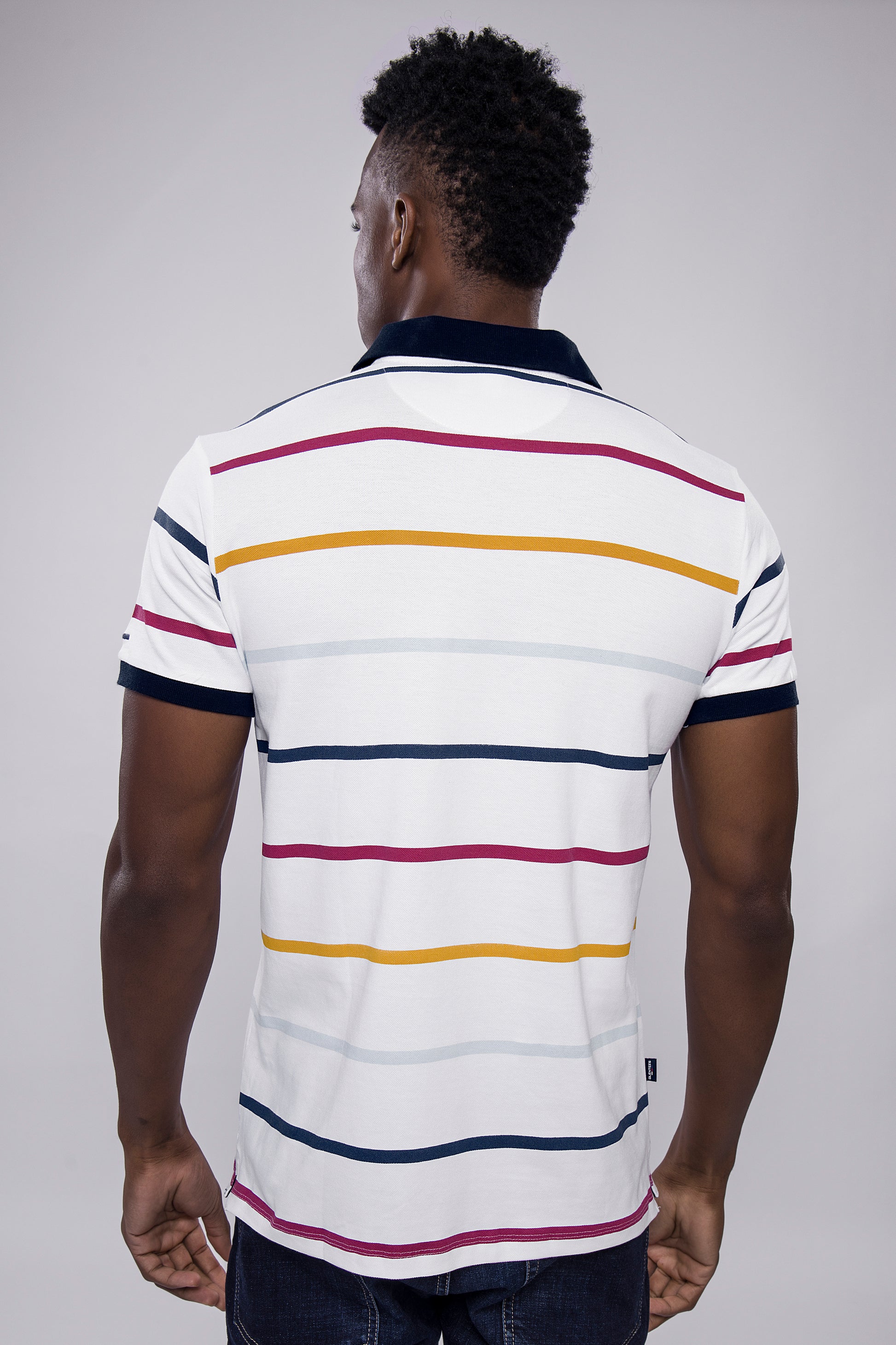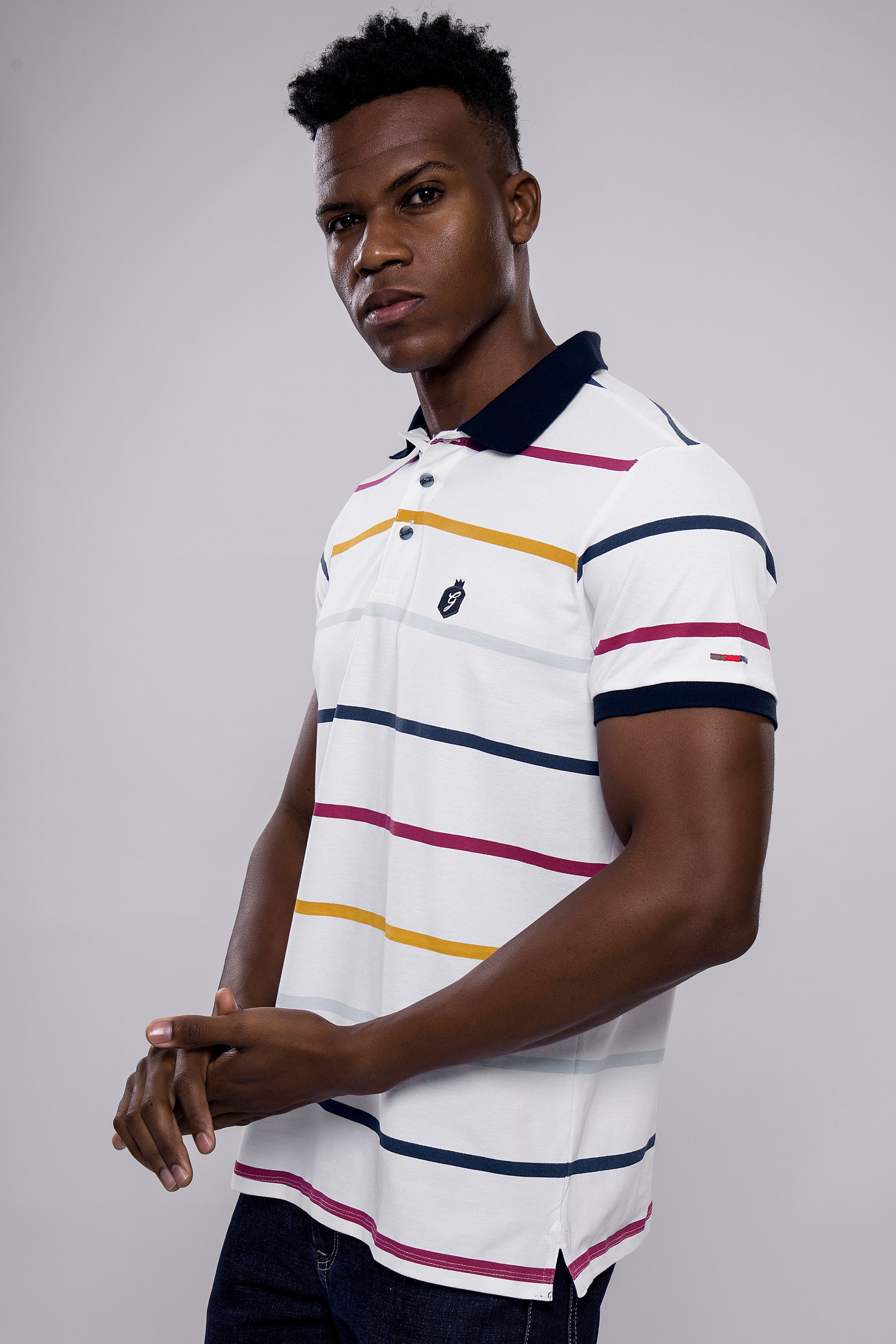 Brighten up your wardrobe with this eye-catching white polo T-shirt, featuring vibrant horizontal stripes in navy, mustard, and maroon tones. Designed with a smart navy collar and embroidered chest badge, this shirt blends playful energy with polished style—ideal for casual days with a fashionable edge.