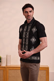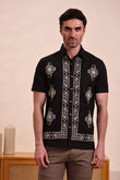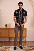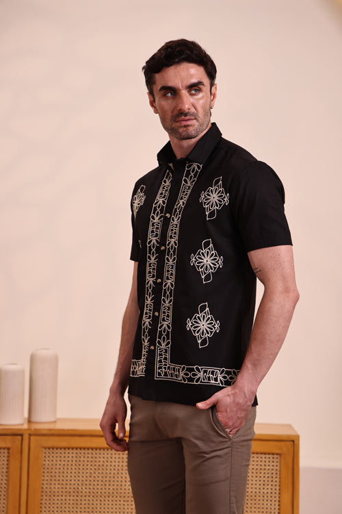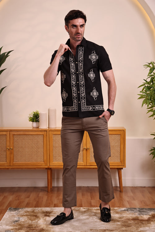 This Black shirt offers a modern take on the classic Guayabera style. The intricate white embroidery on the front panels creates a striking contrast against the earthy green fabric, giving it a sophisticated and unique look. The half-sleeves and relaxed fit make it perfect for warm weather. Pair it with matching olive green trousers or beige chinos for a cohesive and stylish ensemble, suitable for a casual day out or an evening gathering.