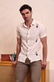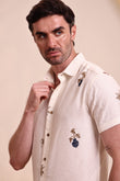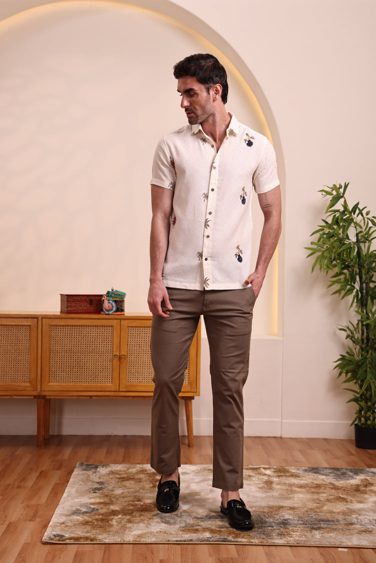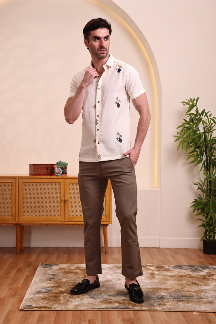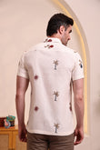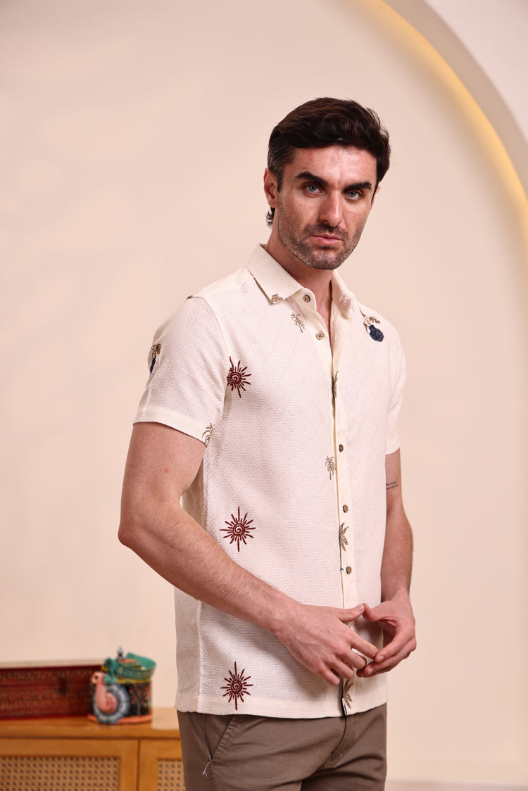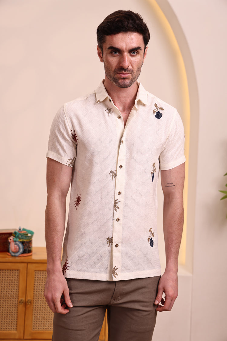 This off-white textured shirt is a perfect choice for a relaxed and stylish look. It features subtle and artistic embroidered motifs, including palm trees and abstract shapes, adding a unique touch to its minimalist base. The half-sleeve design and lightweight fabric make it comfortable for all-day wear, especially in warmer weather. Pair it with light-colored trousers, shorts, or chinos for a smart-casual look perfect for a beach vacation, a casual brunch, or a day out with friends.