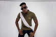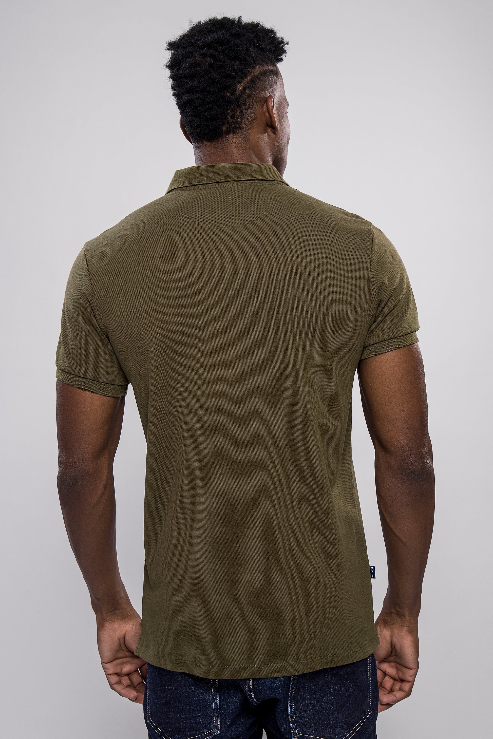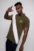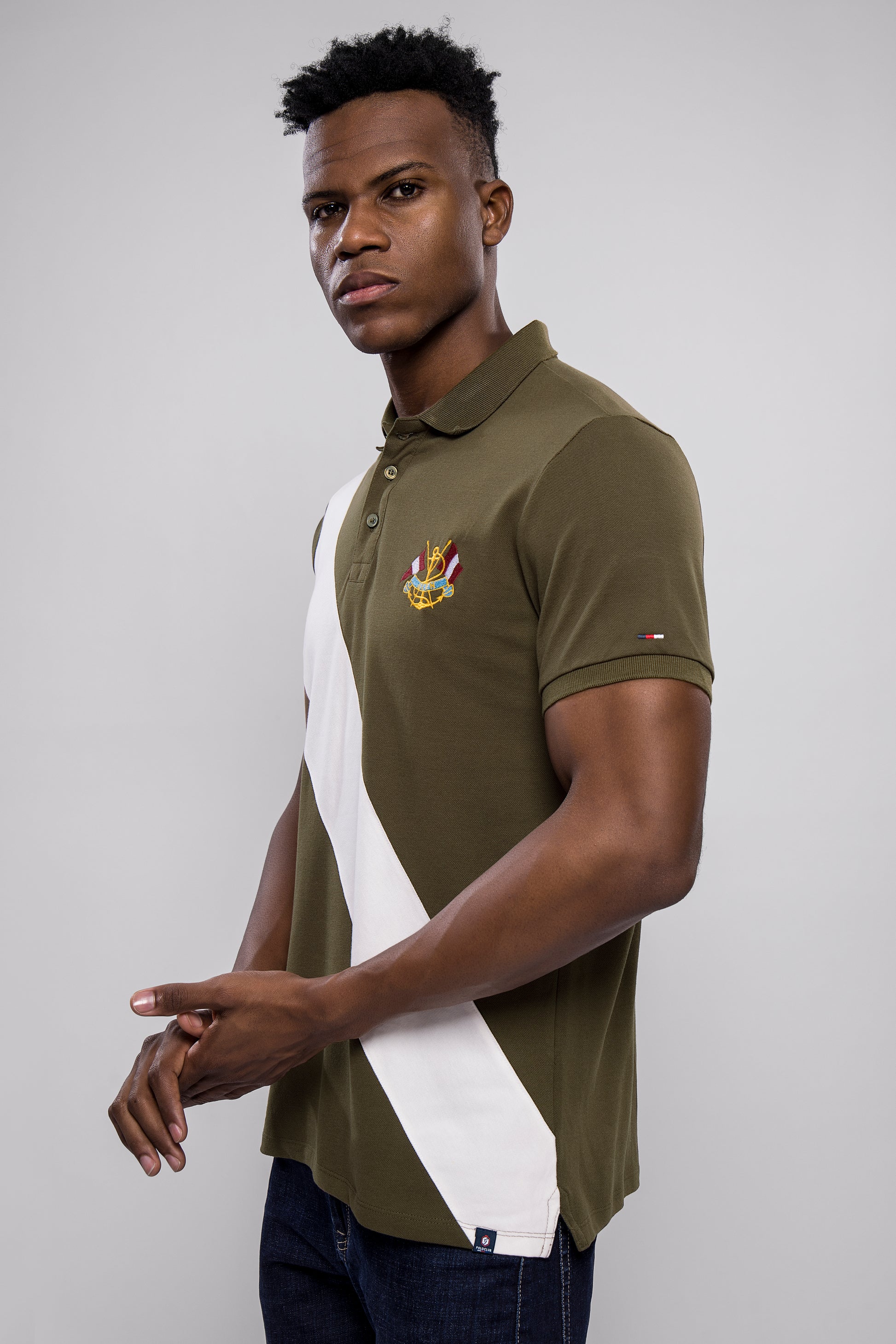Men's Olive Green Polo T-Shirt with White Diagonal Stripe & Crest Embroidery