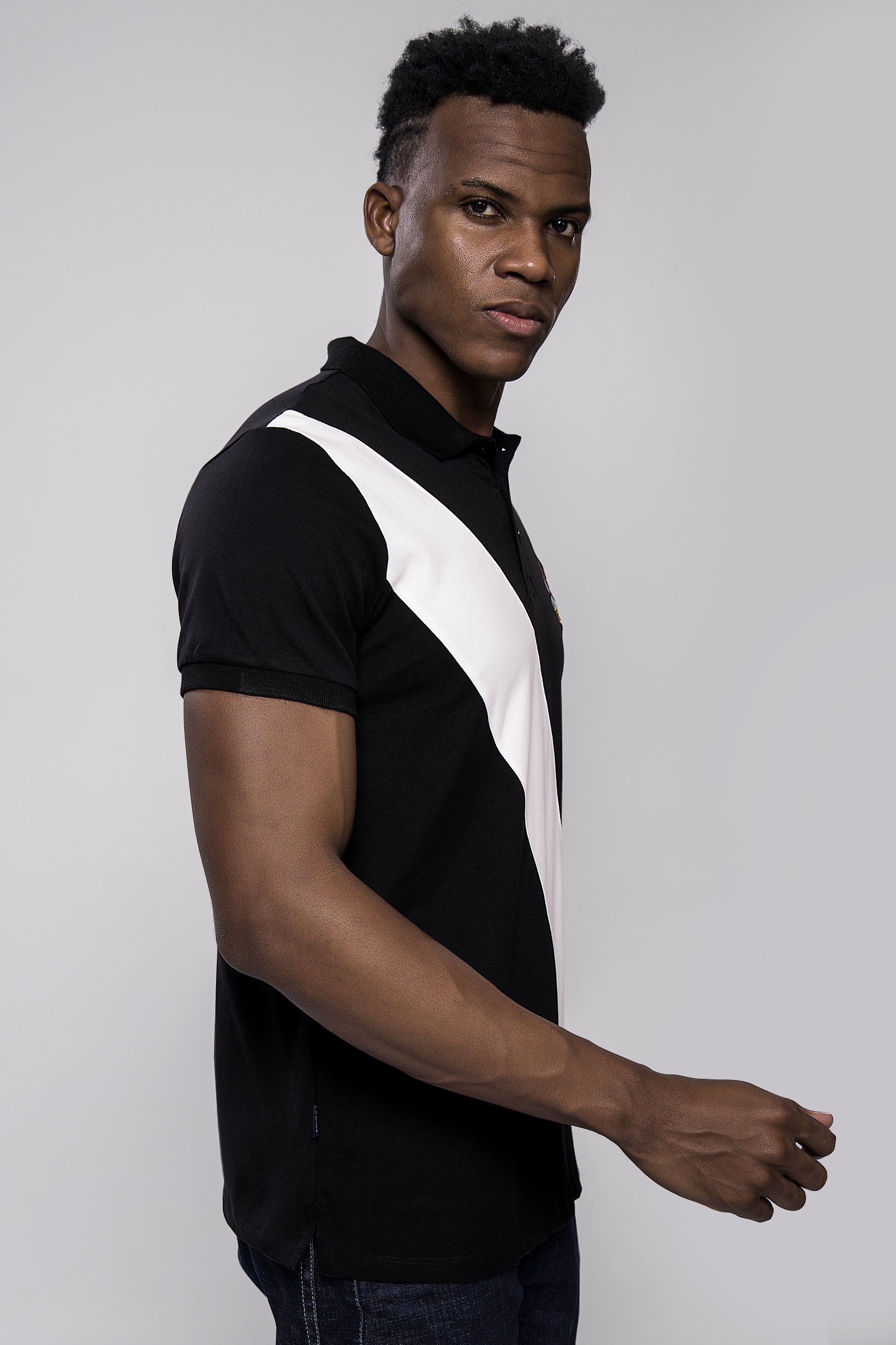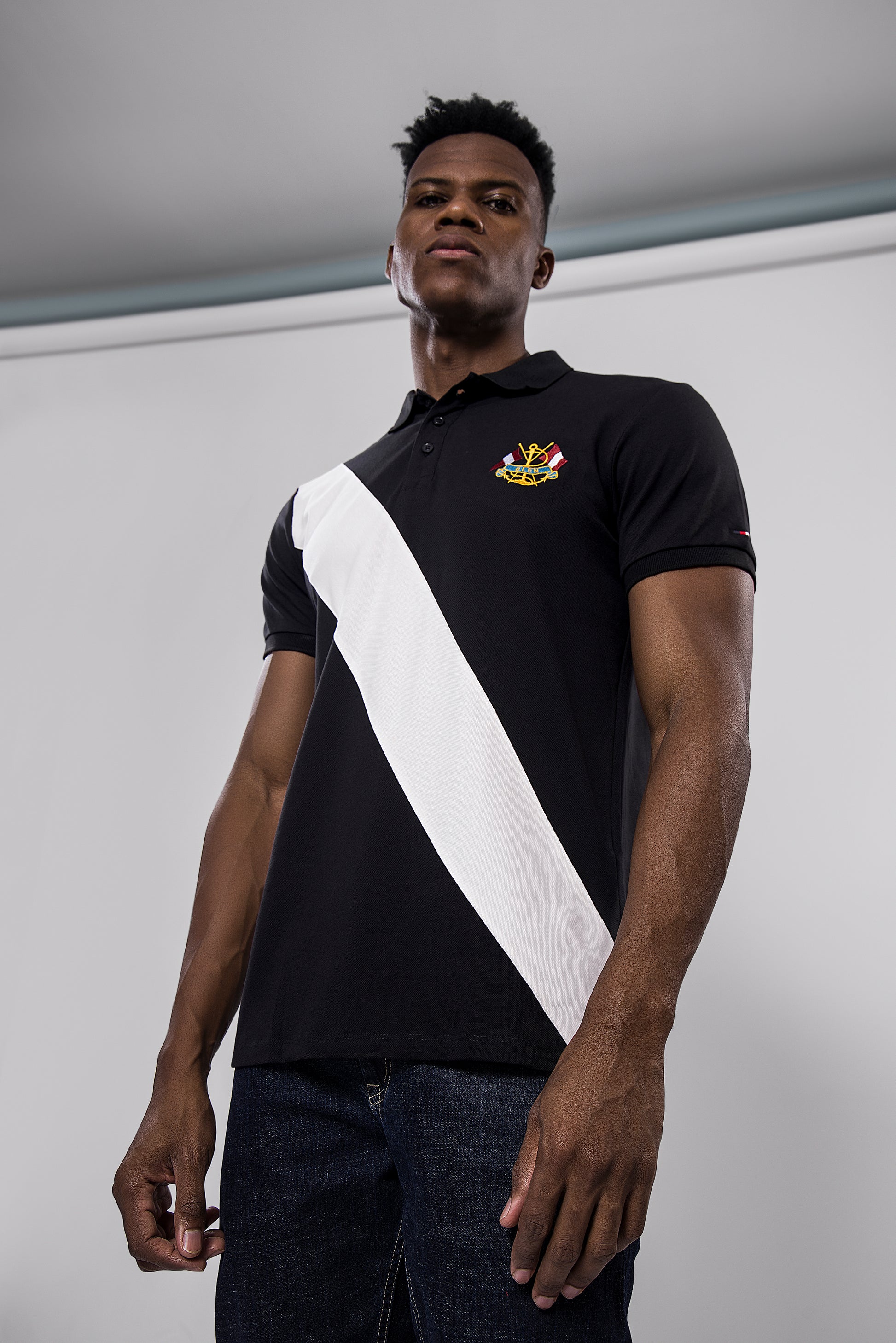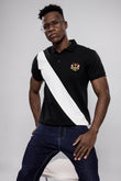 Step up your fashion game with this premium black polo T-shirt, featuring a bold white diagonal stripe and an intricately embroidered crest on the chest. Crafted from high-quality cotton for all-day comfort and breathability, this polo combines classic style with a modern twist. Perfect for casual outings or smart-casual occasions.